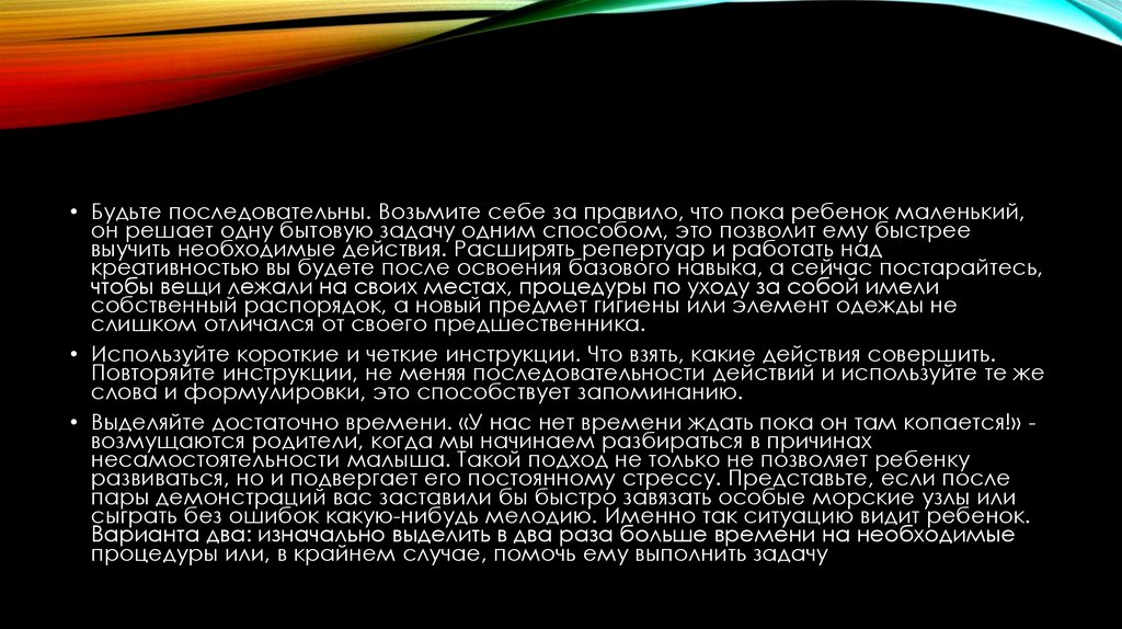• Будьте последовательны. Возьмите себе за правило, что пока ребенок маленький,он решает одну бытовую задачу одним способом, это позволит ему быстрее