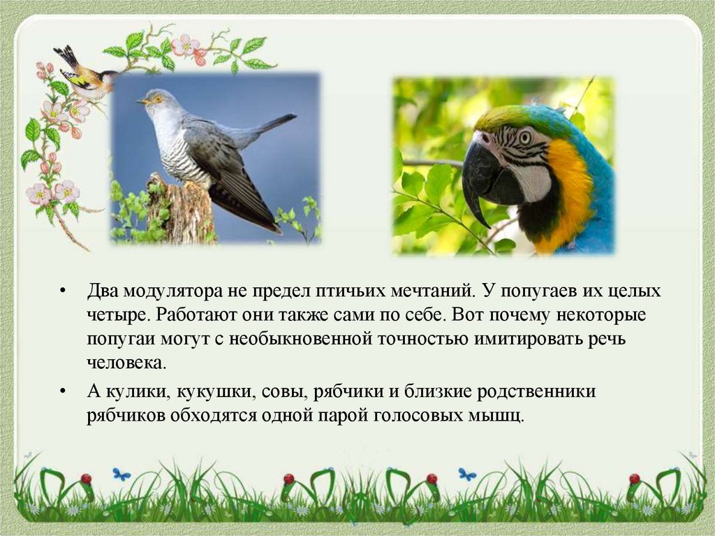 • Два модулятора не предел птичьих мечтаний. У попугаев их целыхчетыре. Работают они также сами по себе. Вот почему некоторые