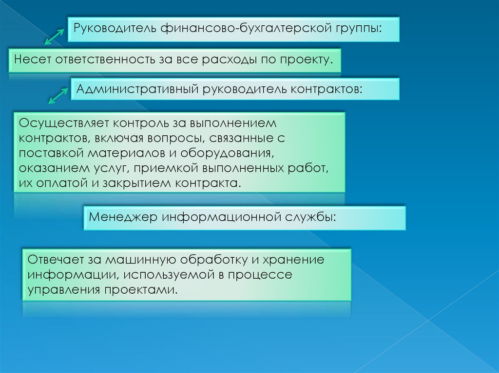 Руководитель финансово-бухгалтерской группы:Несет ответственность за все расходы по проекту.