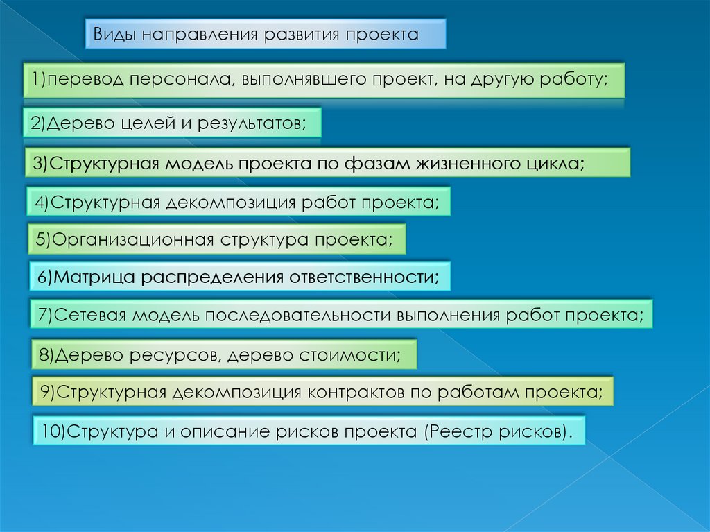 Виды направления развития проекта1)перевод персонала, выполнявшего проект, на другую работу;