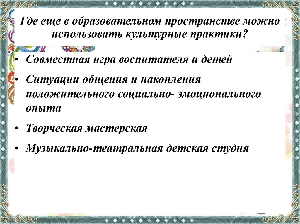 Где еще в образовательном пространстве можноиспользовать культурные практики?