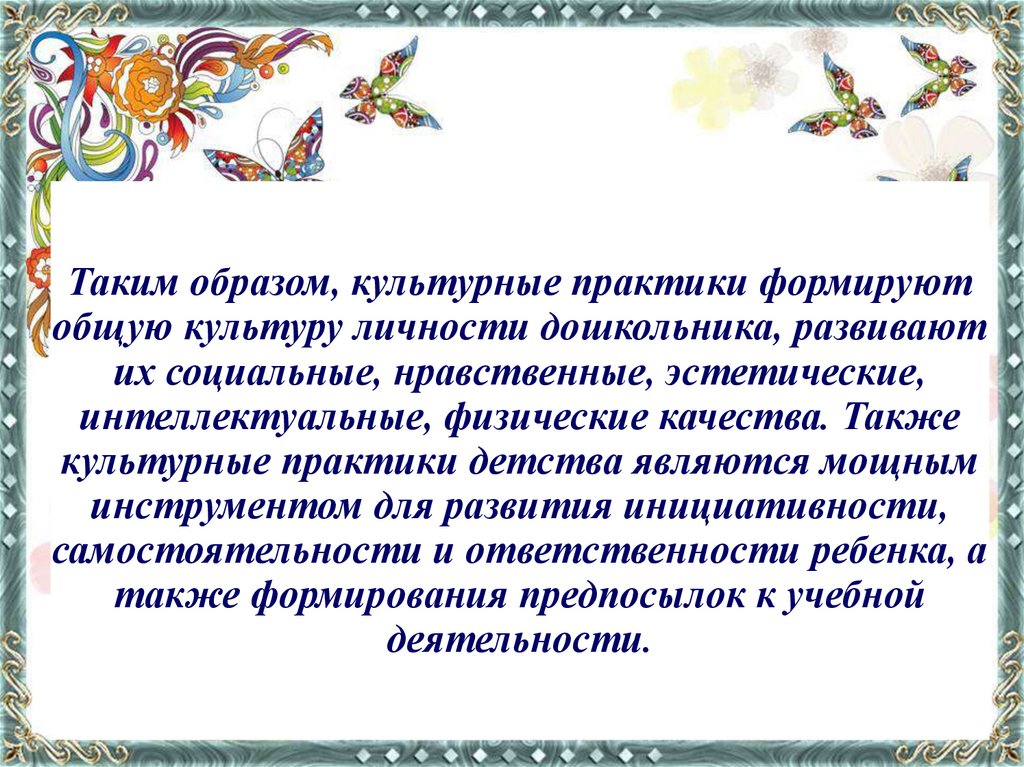Таким образом, культурные практики формируютобщую культуру личности дошкольника, развивают