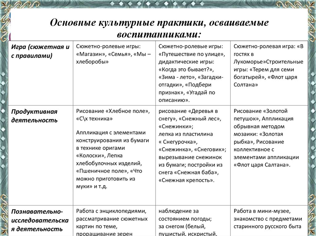 Основные культурные практики, осваиваемыевоспитанниками: