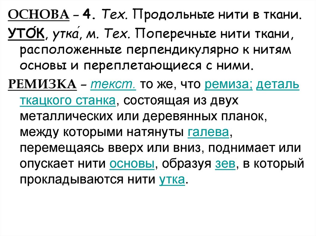 ОСНОВА – 4. Тех. Продольные нити в ткани.УТО́К, утка́, м. Тех. Поперечные нити ткани,