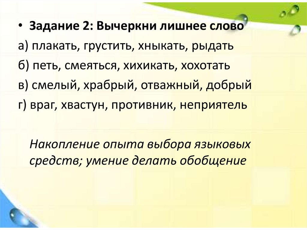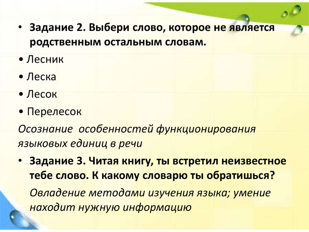• Задание 2. Выбери слово, которое не являетсяродственным остальным словам.