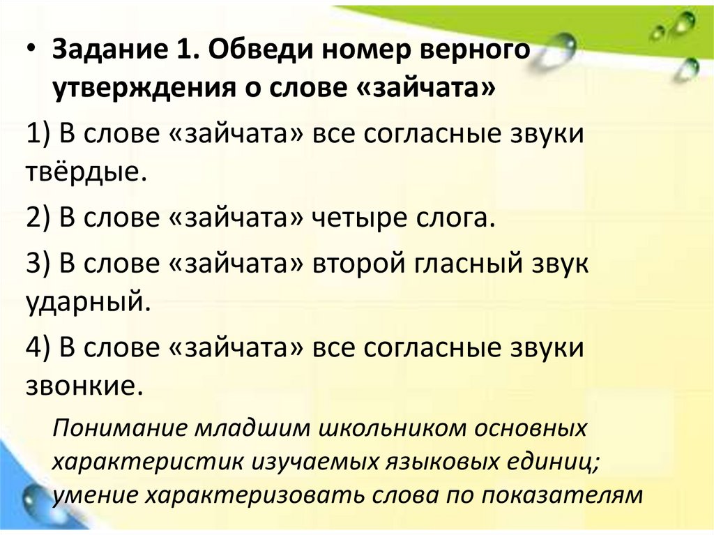 • Задание 1. Обведи номер верногоутверждения о слове «зайчата»