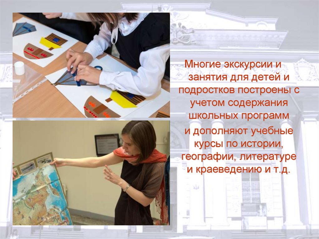 • Обзорная экскурсия по музею• Экскурсии по основным экспозициям и