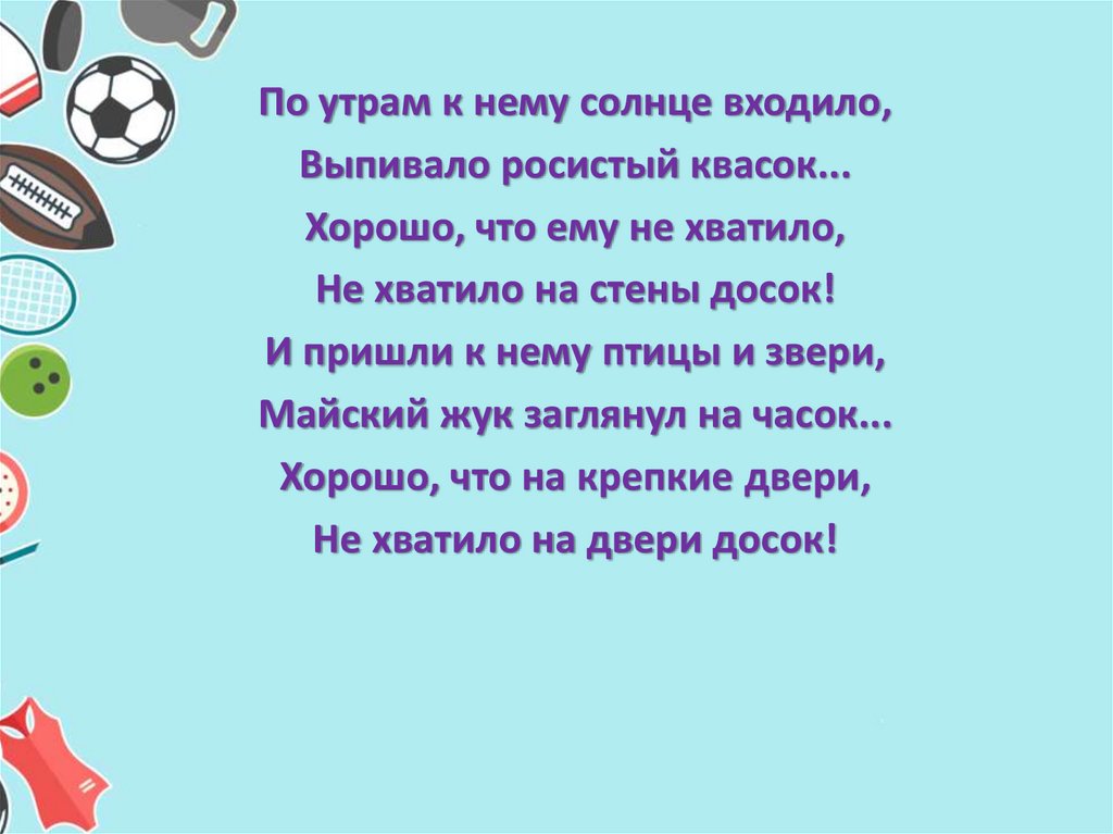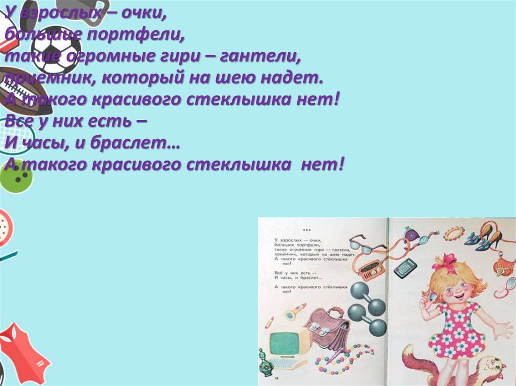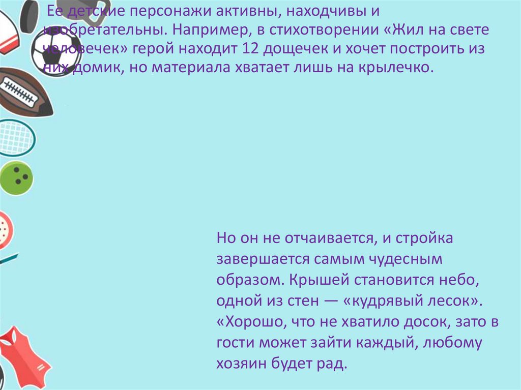 Ее детские персонажи активны, находчивы иизобретательны. Например, в стихотворении «Жил на свете