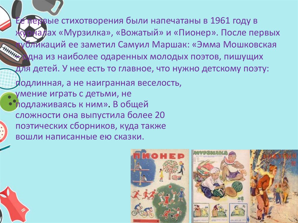 публикаций ее заметил Самуил Маршак: «Эмма Мошковская
