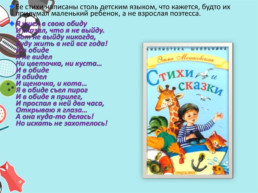 Ее стихи написаны столь детским языком, что кажется, будто ихпридумал маленький ребенок, а не взрослая поэтесса.