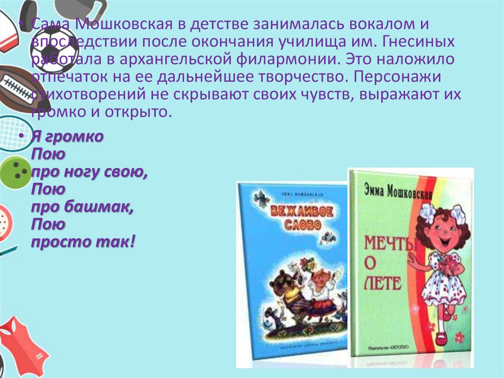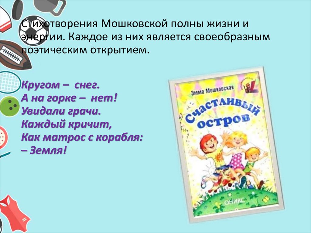 Стихотворения Мошковской полны жизни иэнергии. Каждое из них является своеобразным