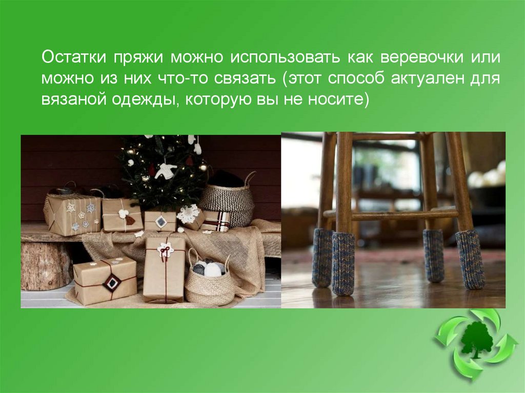 Остатки пряжи можно использовать как веревочки илиможно из них что-то связать (этот способ актуален для