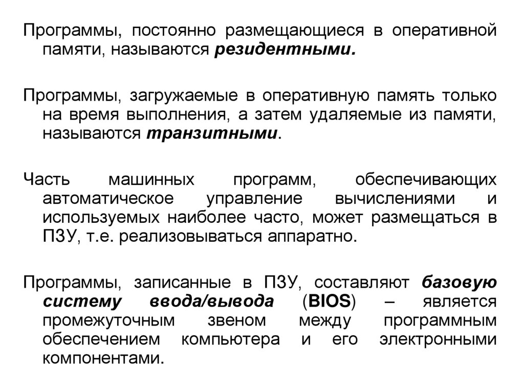 Программы, постоянно размещающиеся в оперативнойпамяти, называются резидентными.