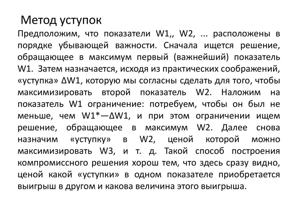 Метод уступокПредположим, что показатели W1,, W2, ... расположены в