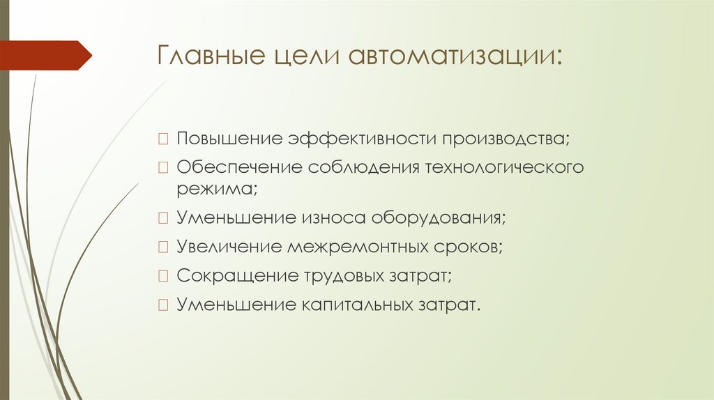 Главные цели автоматизации:Повышение эффективности производства;