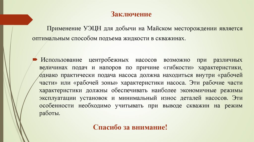 ЗаключениеПрименение УЭЦН для добычи на Майском месторождении является