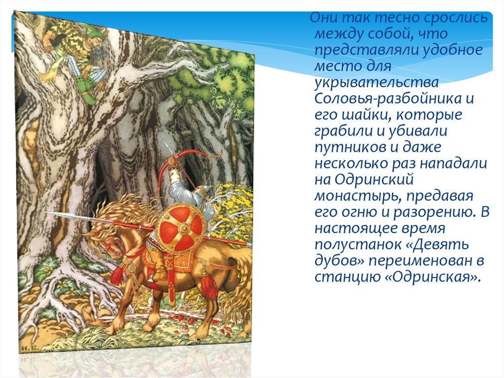 8. Илья разогнал шайку разбойников, а схваченного им главаря банды Соловья-разбойника отвез в Киев к князю.
