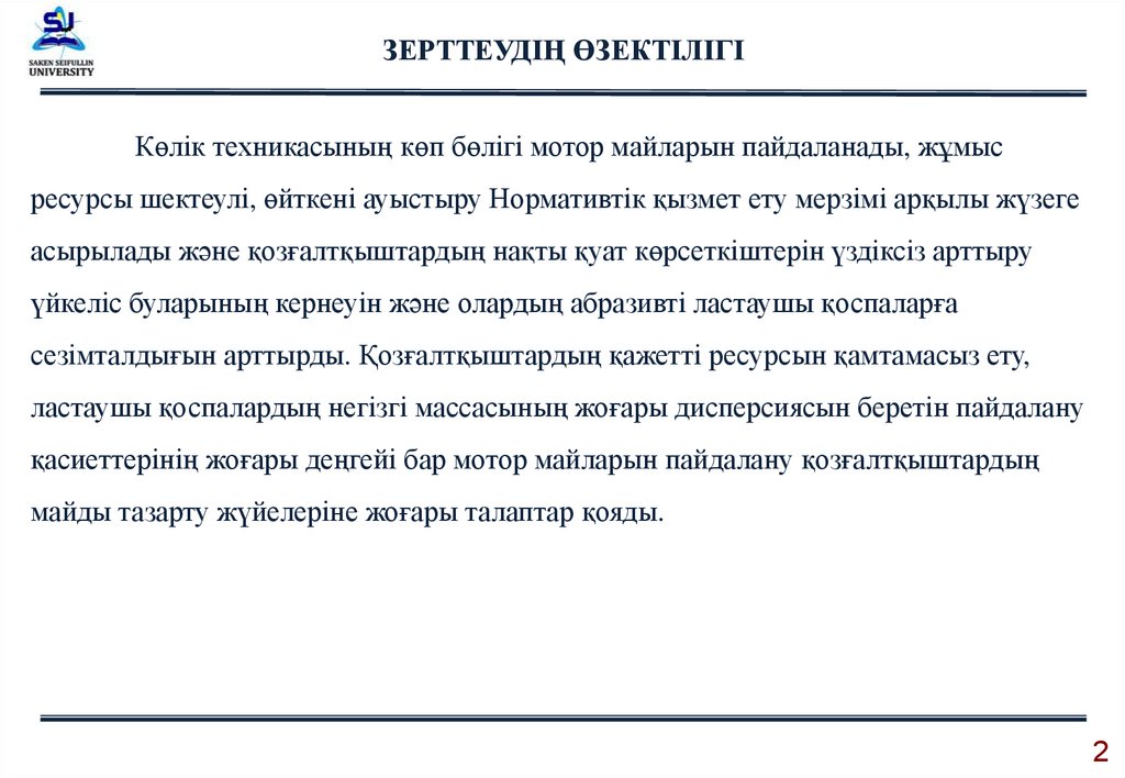 ЗЕРТТЕУДІҢ ӨЗЕКТІЛІГІКөлік техникасының көп бөлігі мотор майларын пайдаланады, жұмыс