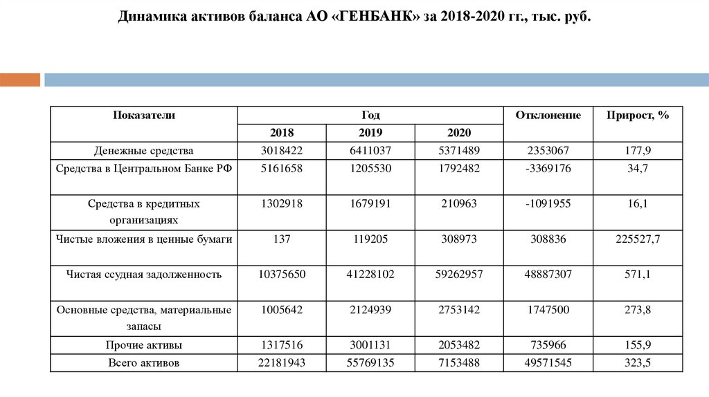 Динамика активов баланса АО «ГЕНБАНК» за 2018-2020 гг., тыс. руб.Показатели