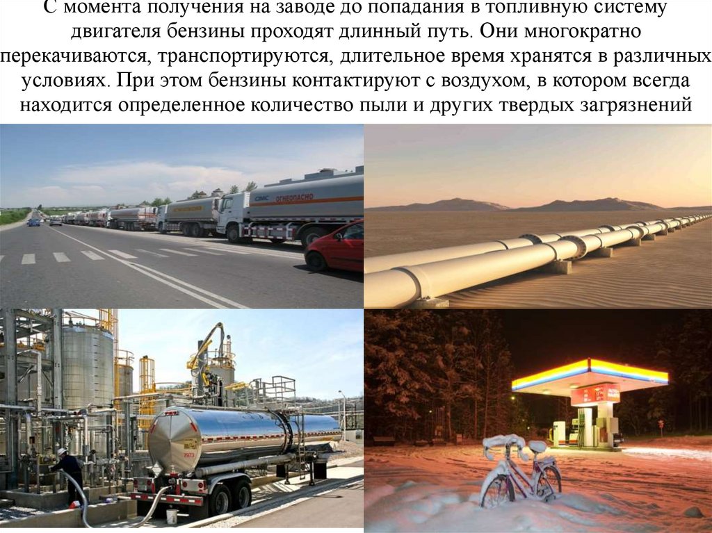 С момента получения на заводе до попадания в топливную системудвигателя бензины проходят длинный путь. Они многократно
