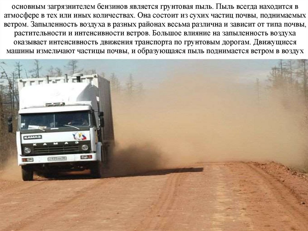 основным загрязнителем бензинов является грунтовая пыль. Пыль всегда находится ватмосфере в тех или иных количествах. Она состоит из сухих частиц почвы, поднимаемых