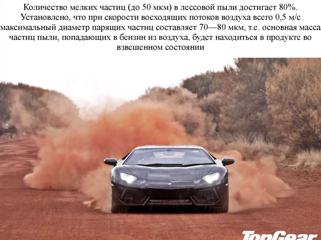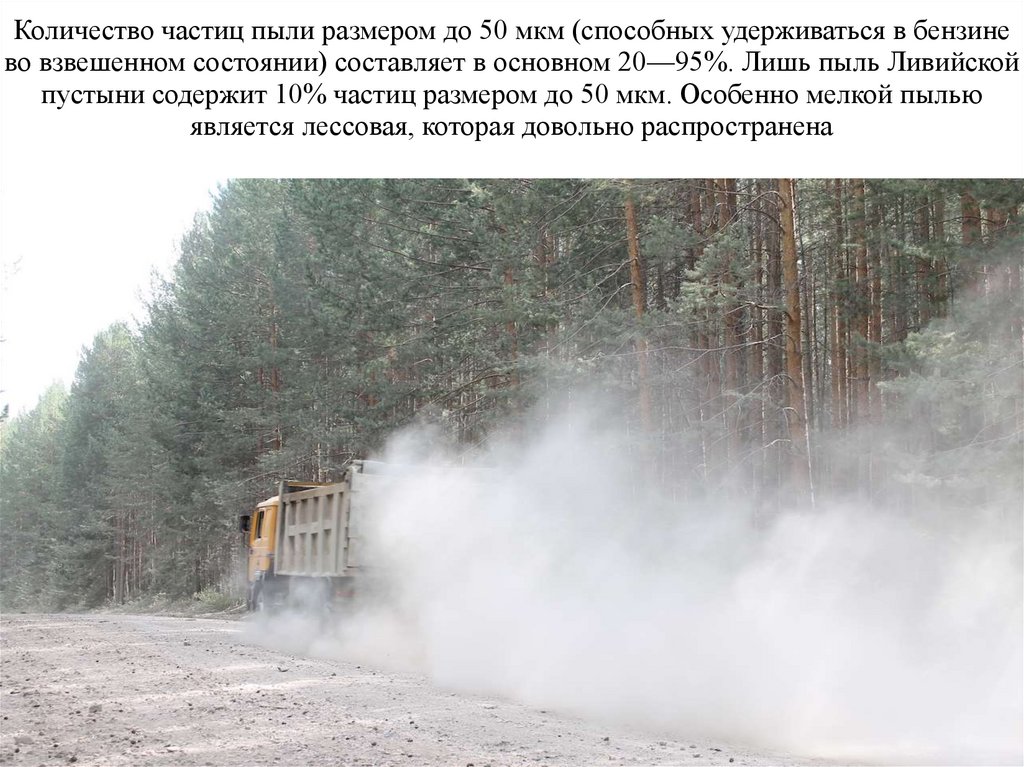 Количество частиц пыли размером до 50 мкм (способных удерживаться в бензинево взвешенном состоянии) составляет в основном 20—95%. Лишь пыль Ливийской