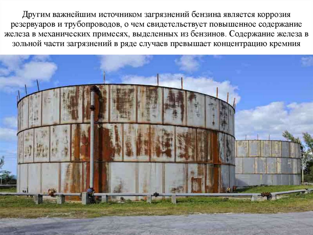 Другим важнейшим источником загрязнений бензина является коррозиярезервуаров и трубопроводов, о чем свидетельствует повышенное содержание