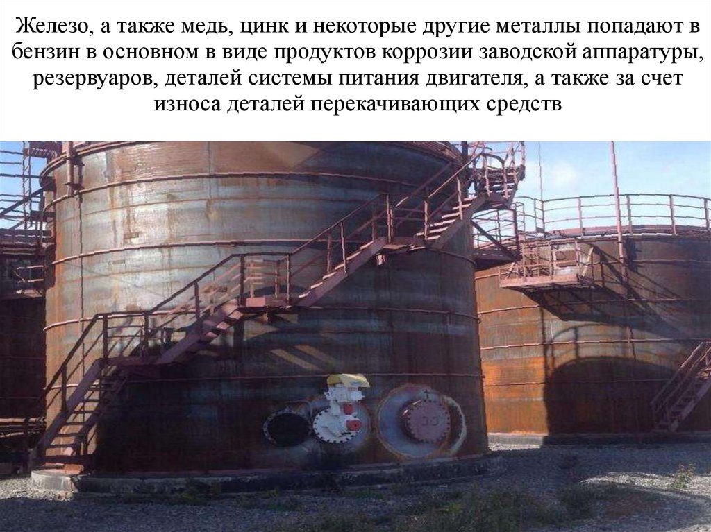 Железо, а также медь, цинк и некоторые другие металлы попадают вбензин в основном в виде продуктов коррозии заводской аппаратуры,