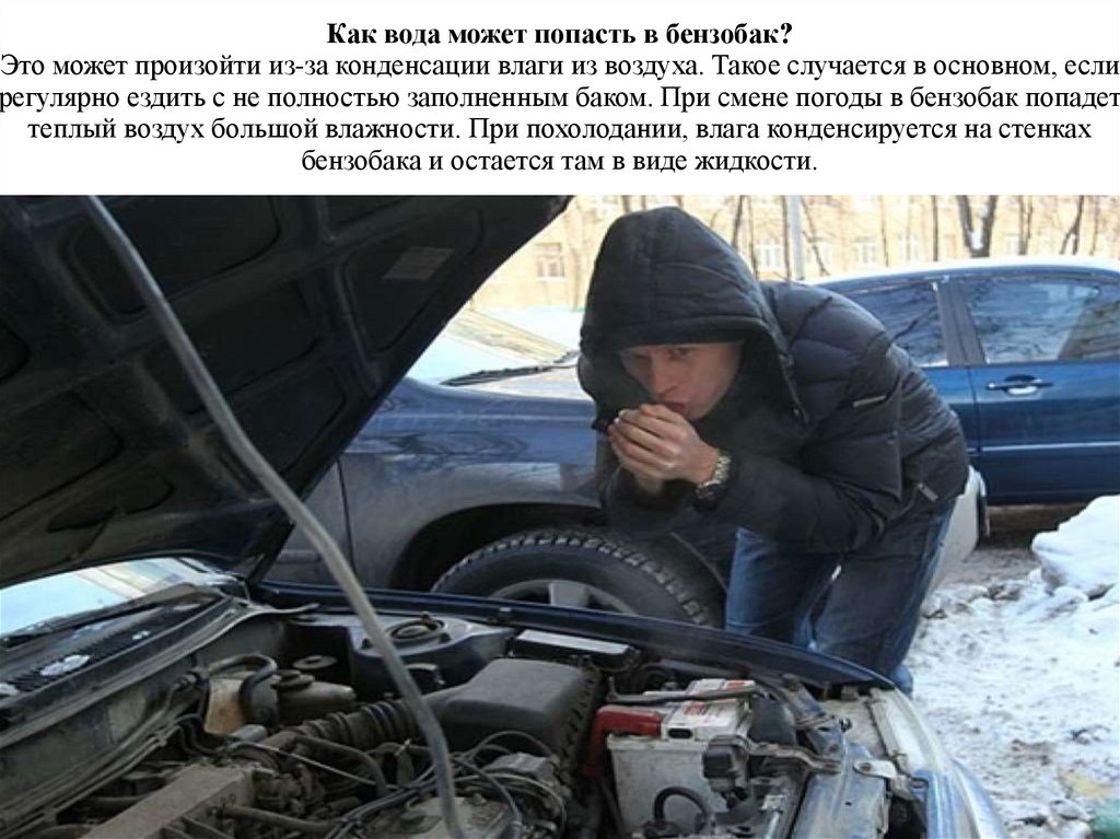 Как вода может попасть в бензобак?Это может произойти из-за конденсации влаги из воздуха. Такое случается в основном, если