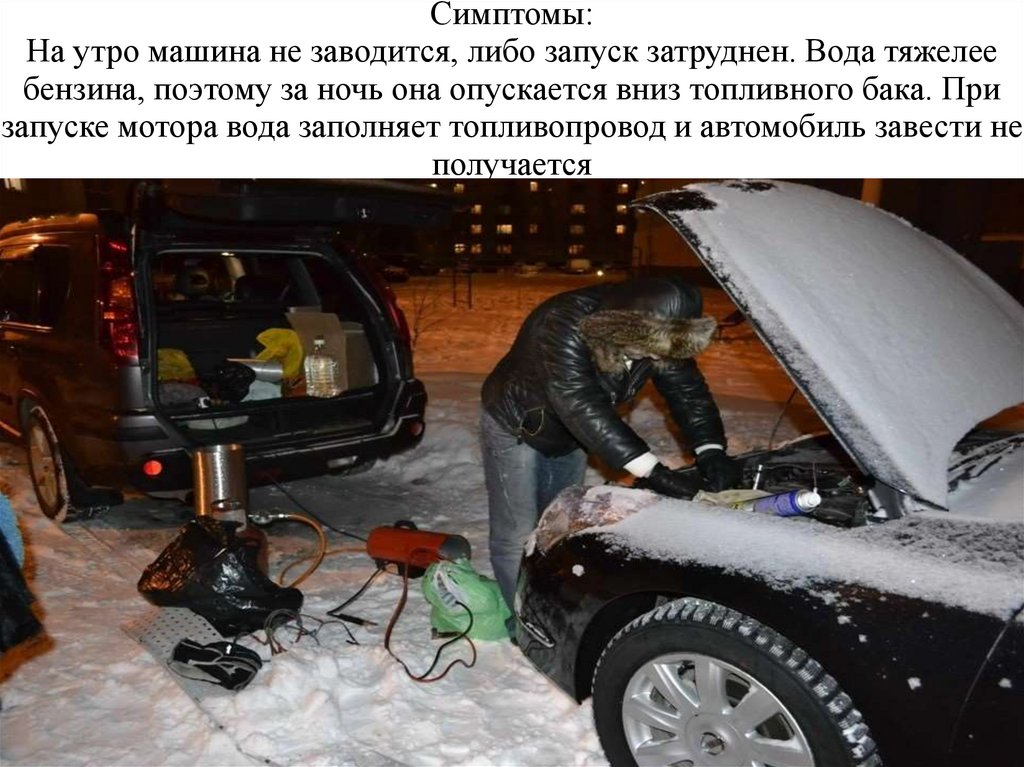 Симптомы:На утро машина не заводится, либо запуск затруднен. Вода тяжелее