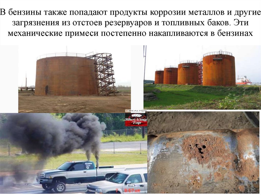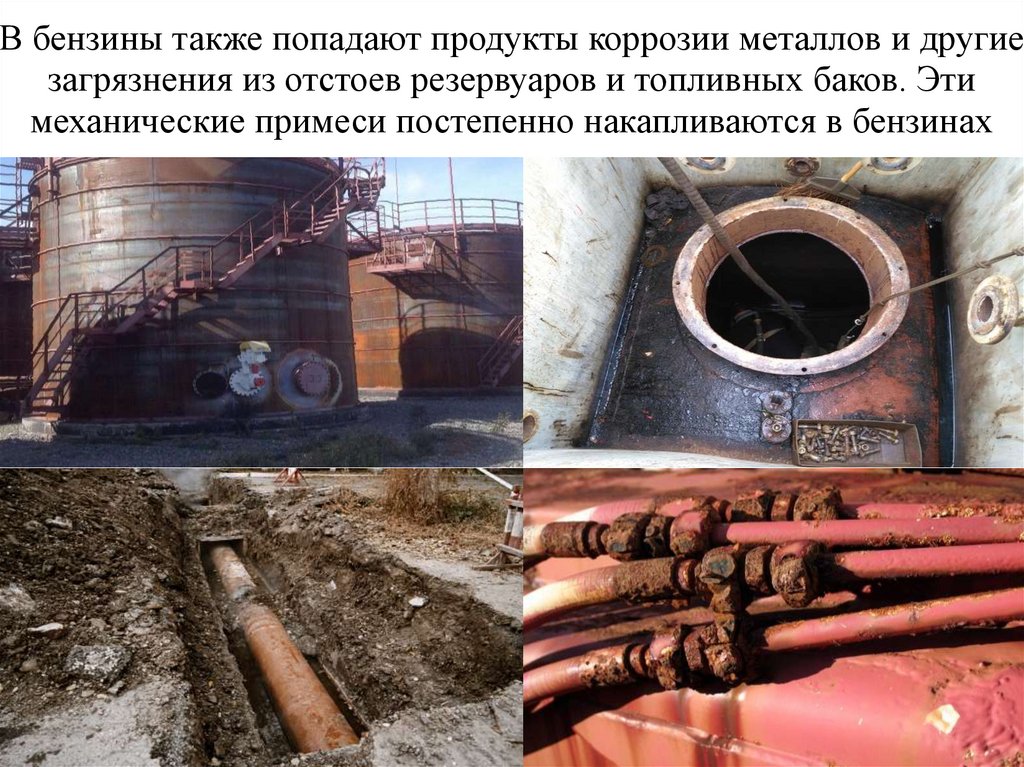 В бензины также попадают продукты коррозии металлов и другиезагрязнения из отстоев резервуаров и топливных баков. Эти