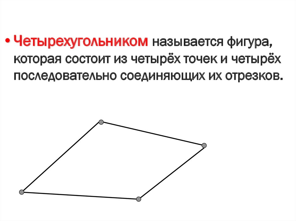 •Четырехугольником называется фигура,которая состоит из четырёх точек и четырёх