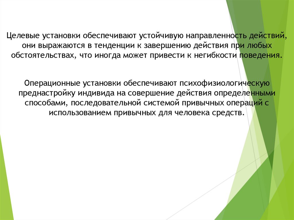 Целевые установки обеспечивают устойчивую направленность действий,они выражаются в тенденции к завершению действия при любых