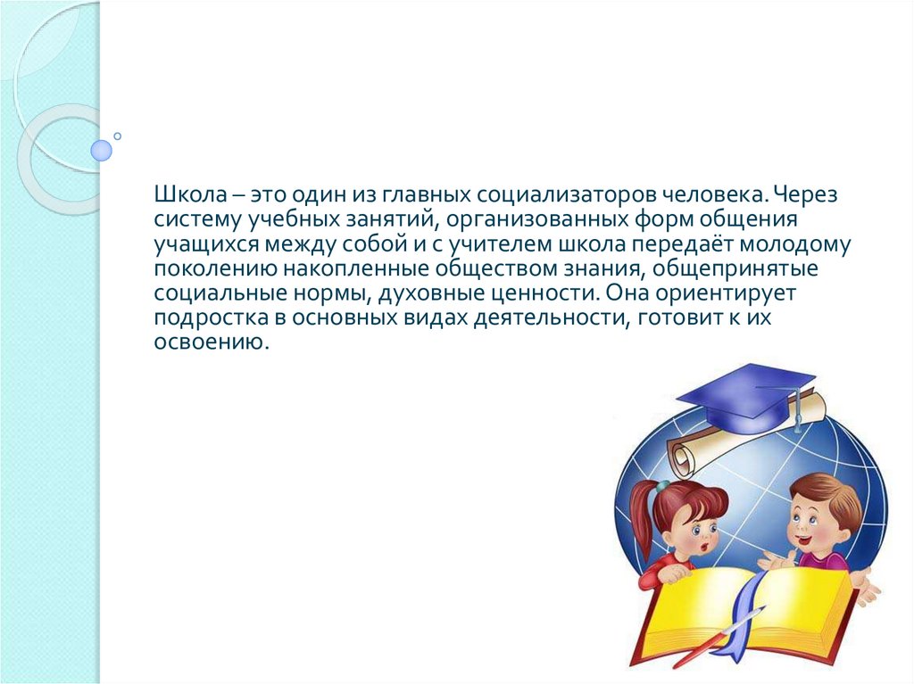 Школа – это один из главных социализаторов человека. Черезсистему учебных занятий, организованных форм общения