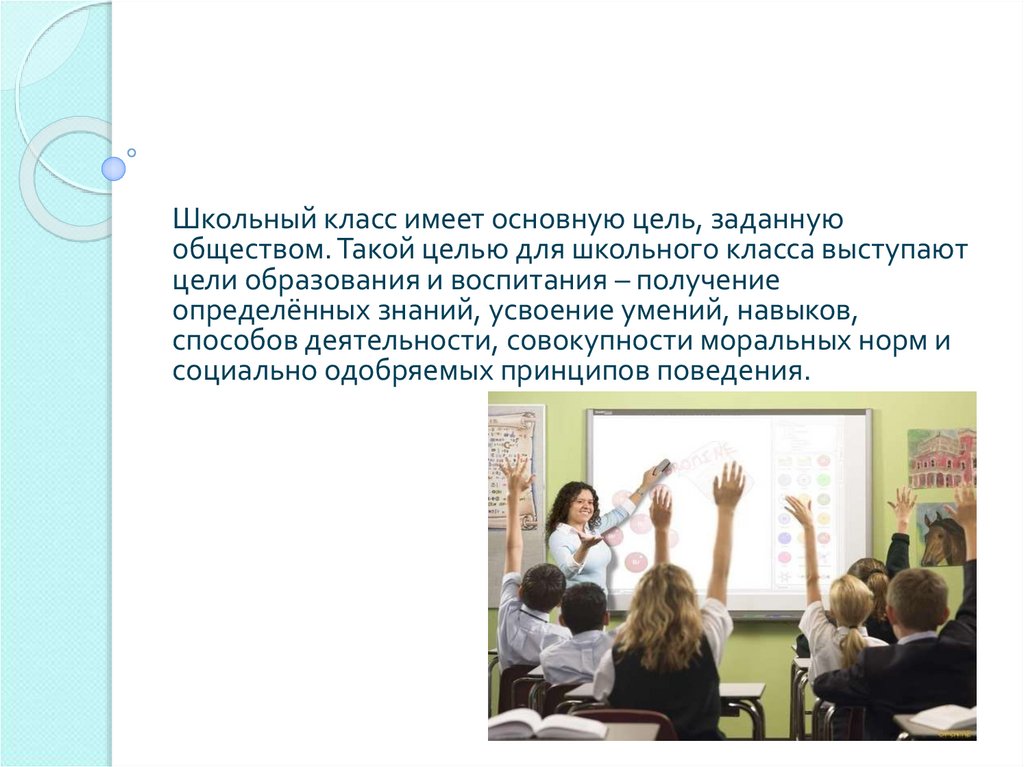 Школьный класс имеет основную цель, заданнуюобществом. Такой целью для школьного класса выступают