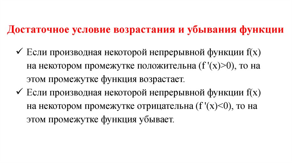 Достаточное условие возрастания и убывания функцииЕсли производная некоторой непрерывной функции f(x)