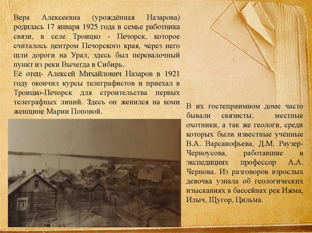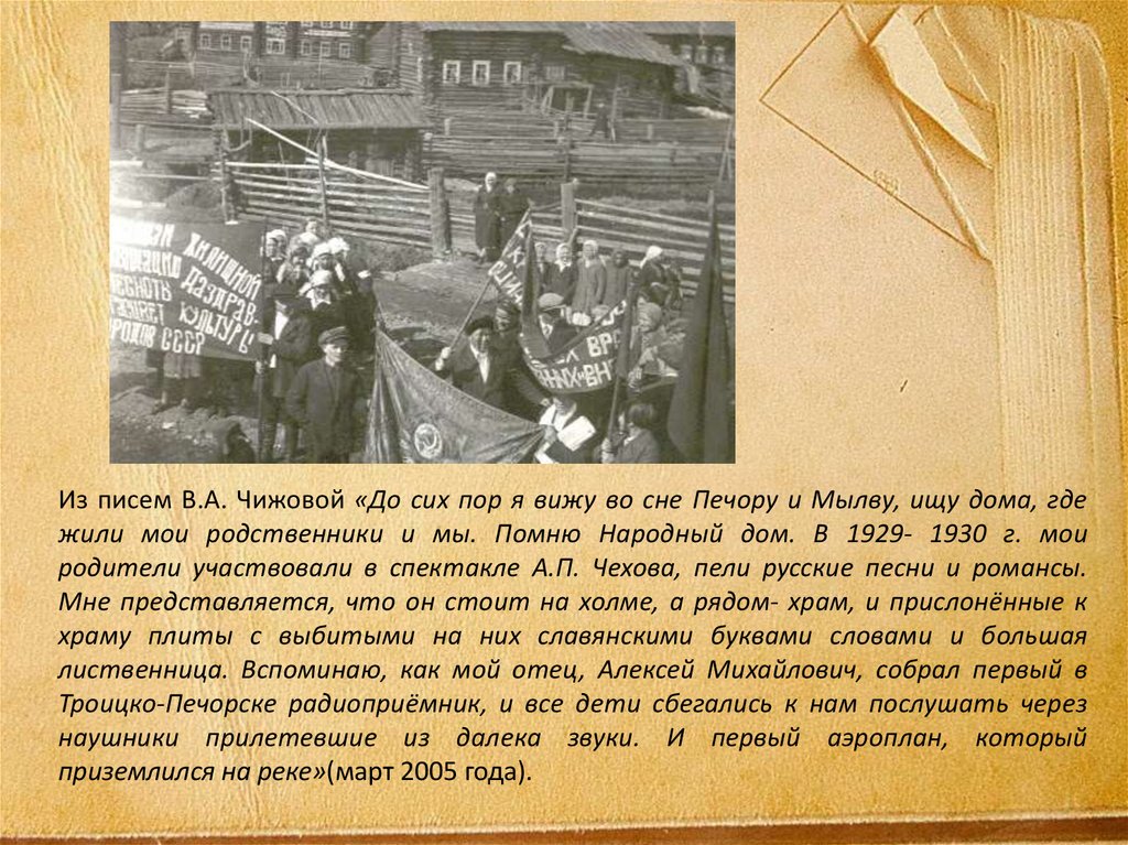 Из писем В.А. Чижовой «До сих пор я вижу во сне Печору и Мылву, ищу дома, гдежили мои родственники и мы. Помню Народный дом. В 1929- 1930 г. мои