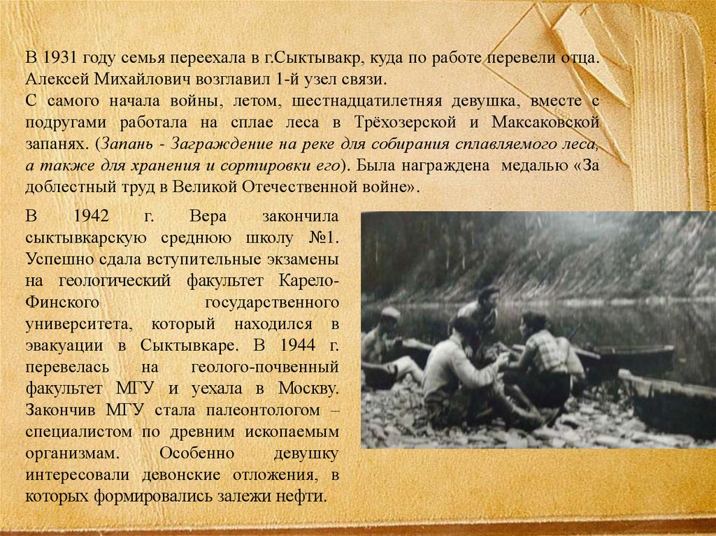 В 1931 году семья переехала в г.Сыктывакр, куда по работе перевели отца.Алексей Михайлович возглавил 1-й узел связи.