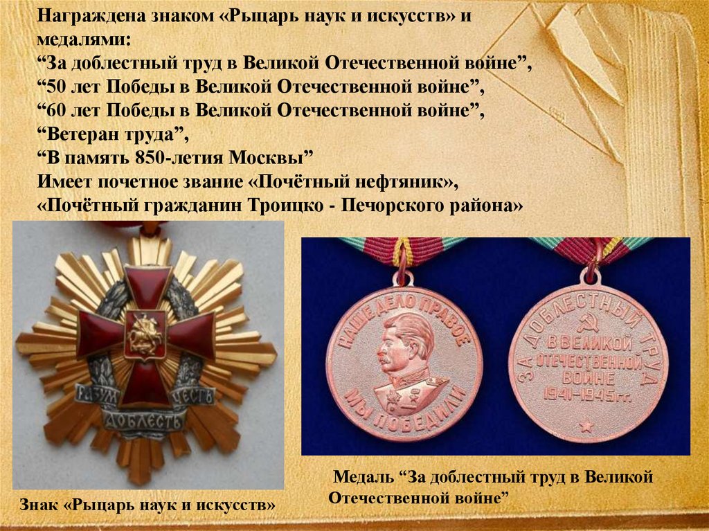 Награждена знаком «Рыцарь наук и искусств» имедалями: