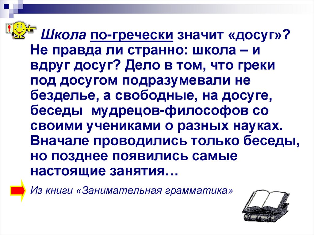 Школа по-гречески значит «досуг»?Не правда ли странно: школа – и