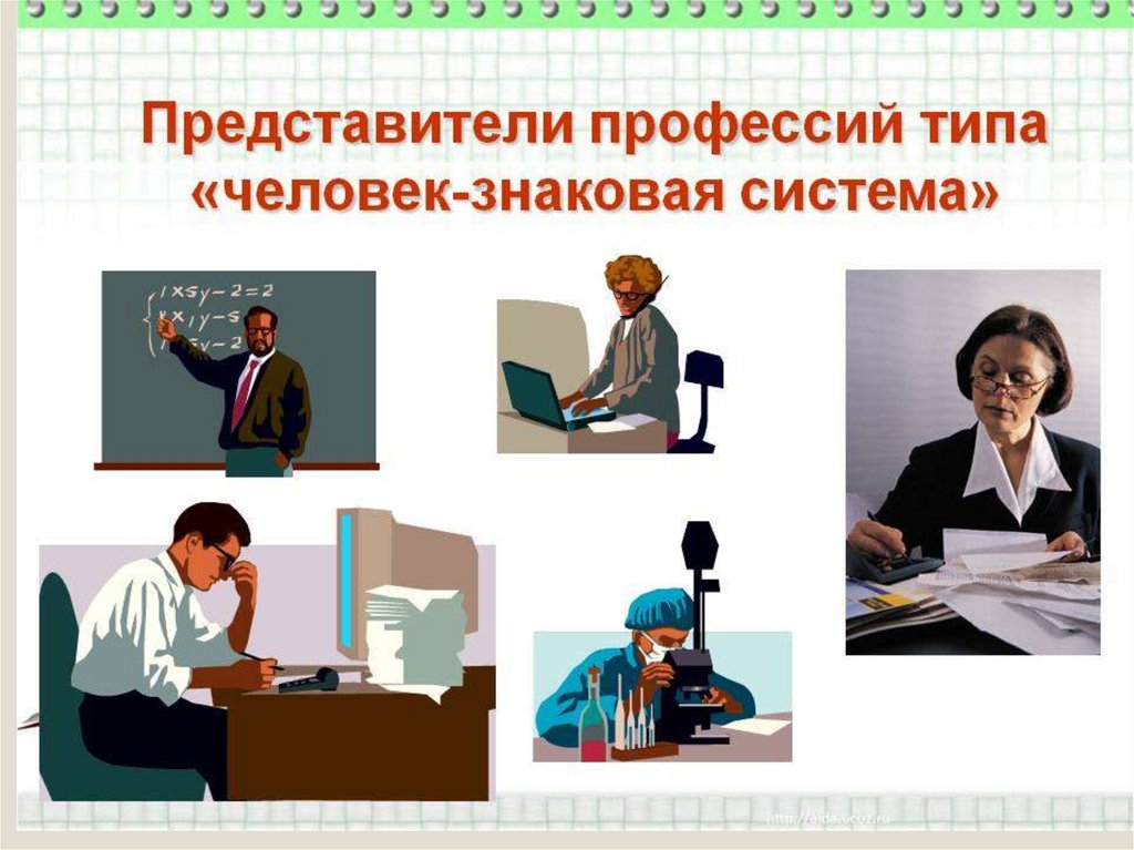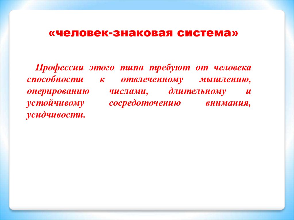 «человек-знаковая система»Профессии этого типа требуют от человека