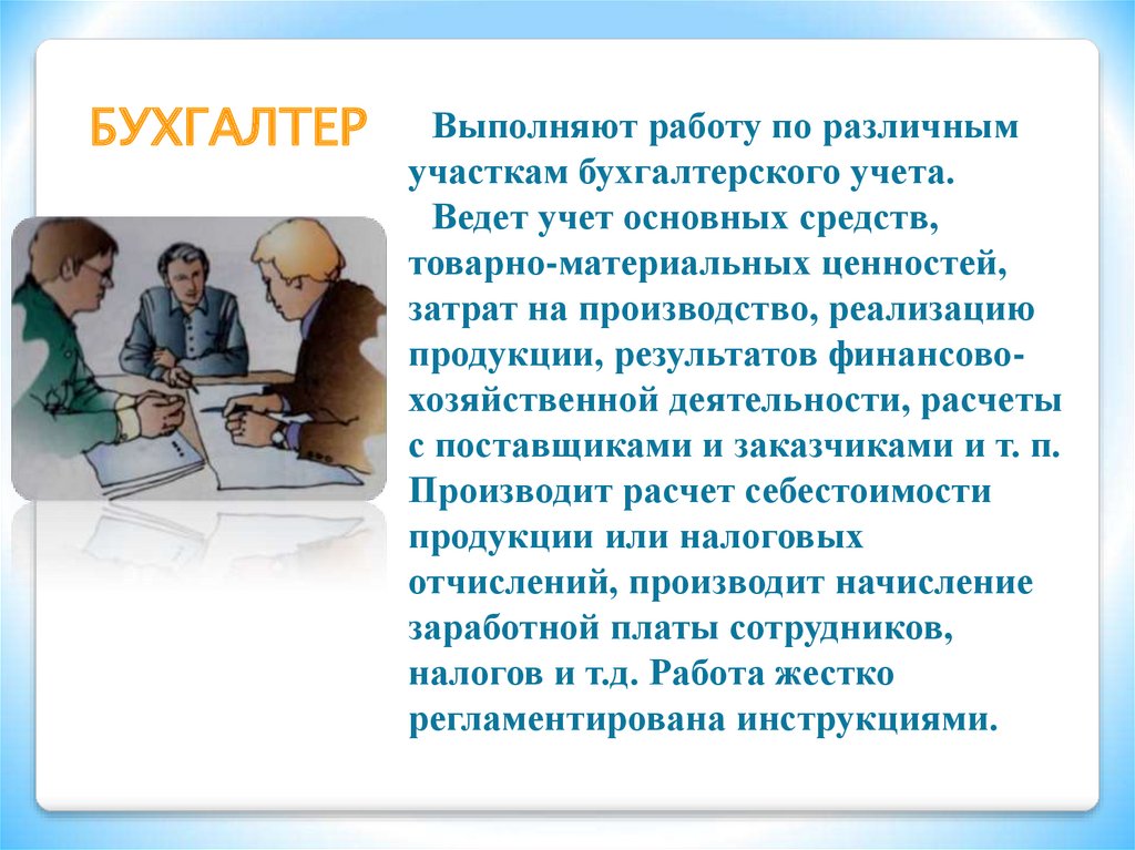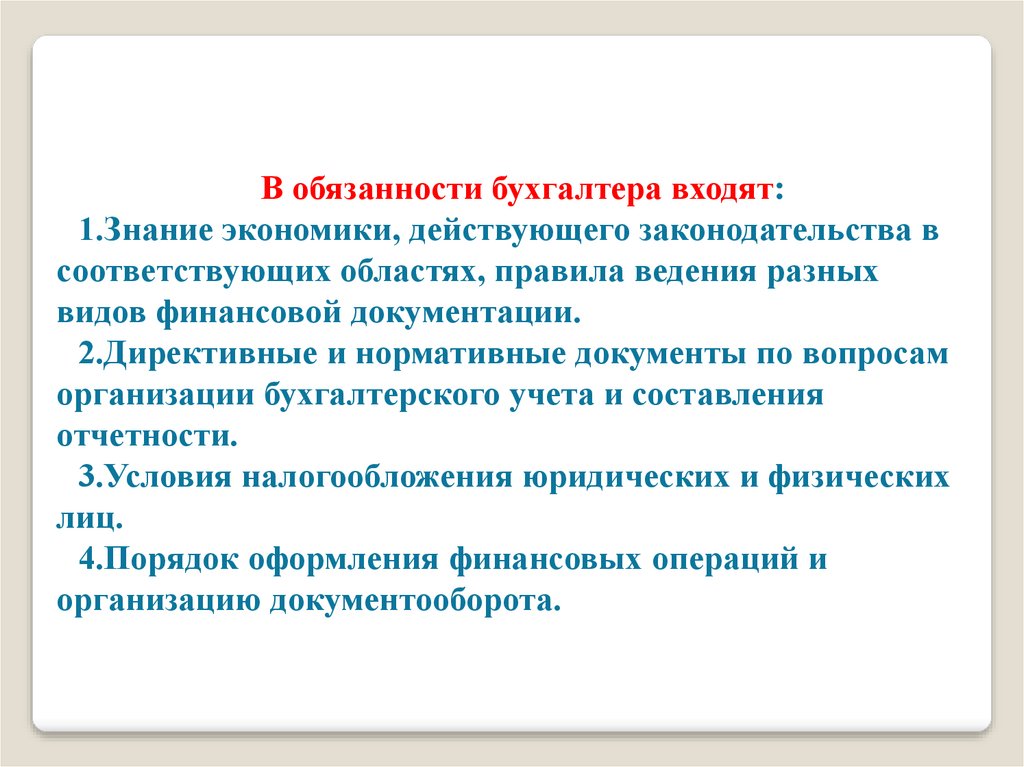 В обязанности бухгалтера входят:1.Знание экономики, действующего законодательства в