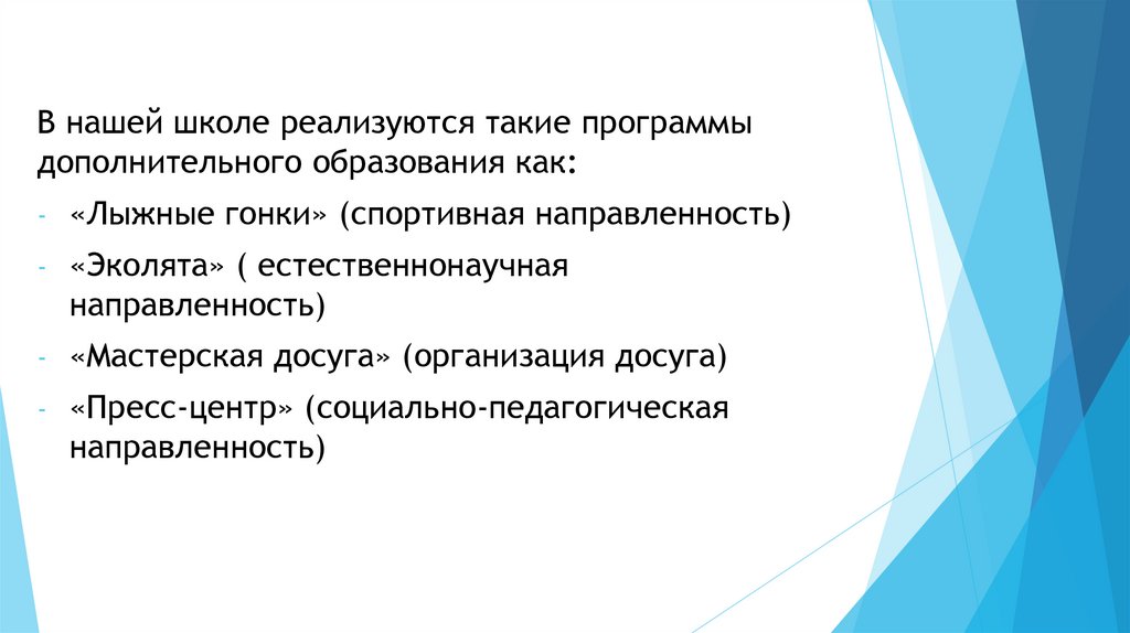 В нашей школе реализуются такие программыдополнительного образования как: