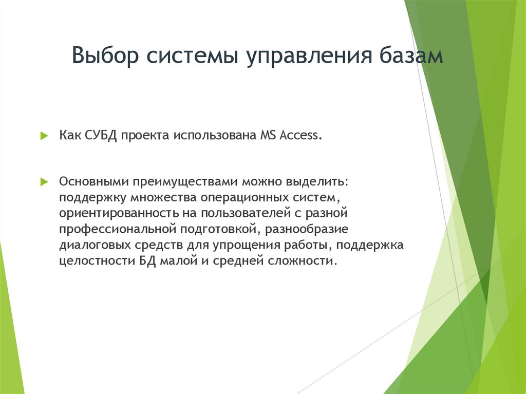 Выбор системы управления базамКак СУБД проекта использована MS Access.