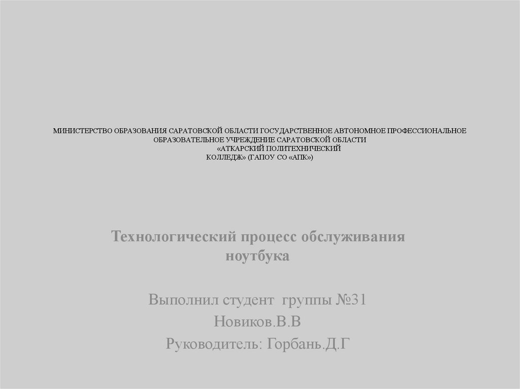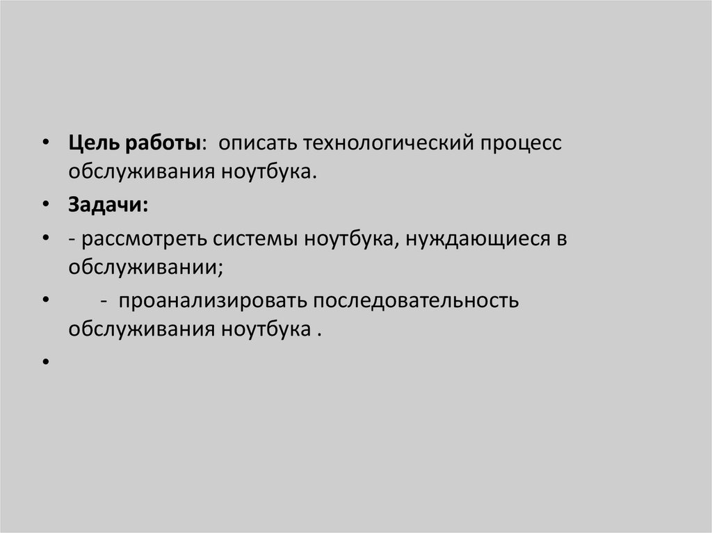 • Цель работы: описать технологический процессобслуживания ноутбука.