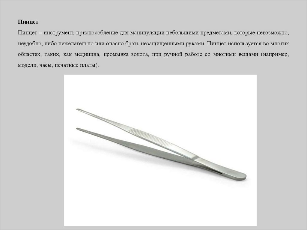 ПинцетПинцет – инструмент, приспособление для манипуляции небольшими предметами, которые невозможно,