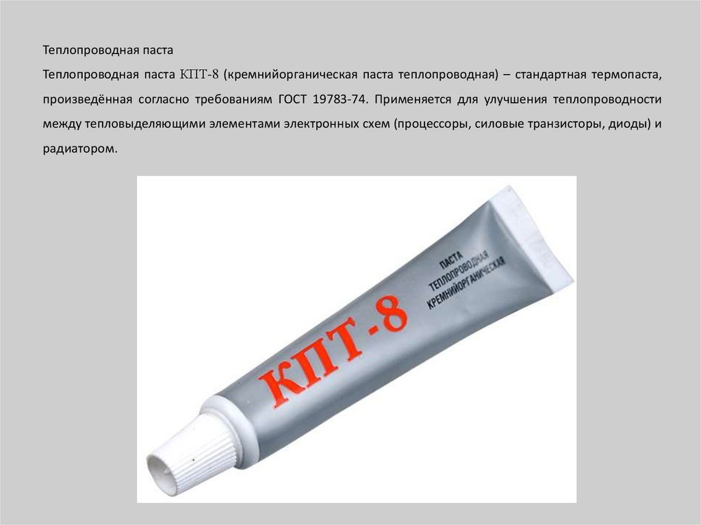 Теплопроводная пастаТеплопроводная паста КПТ-8 (кремнийорганическая паста теплопроводная) – стандартная термопаста,