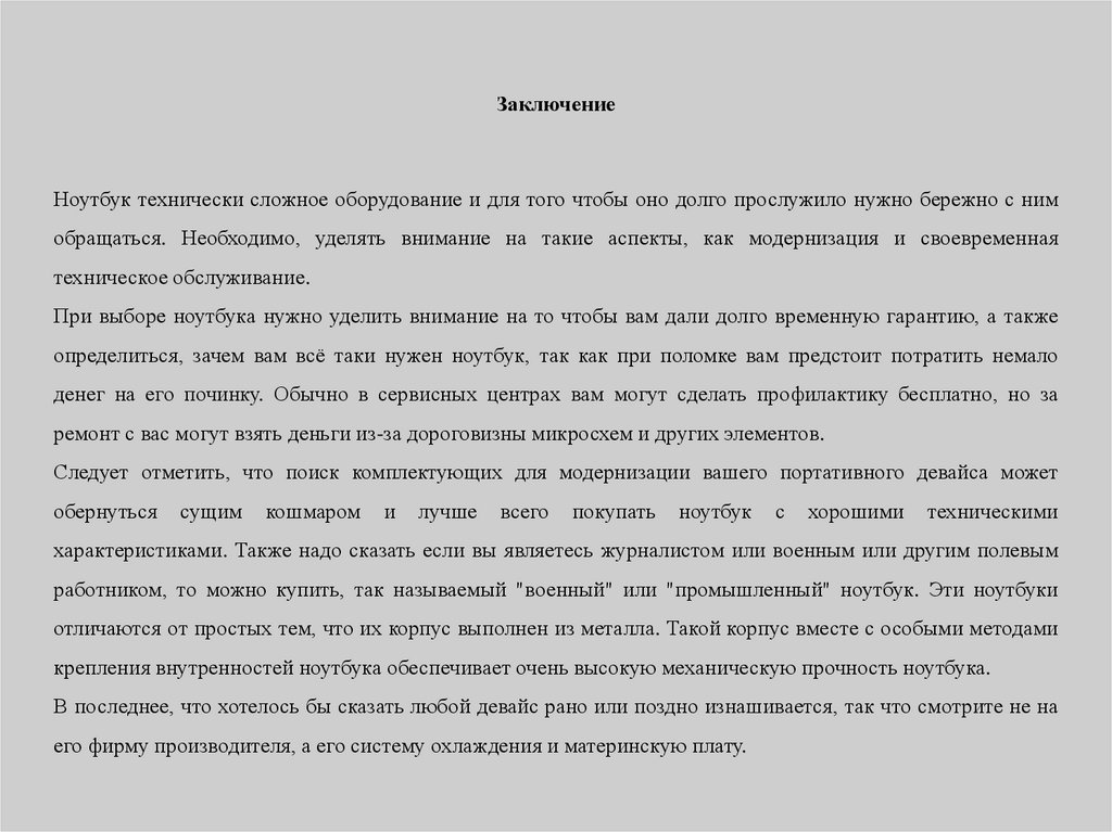 ЗаключениеНоутбук технически сложное оборудование и для того чтобы оно долго прослужило нужно бережно с ним