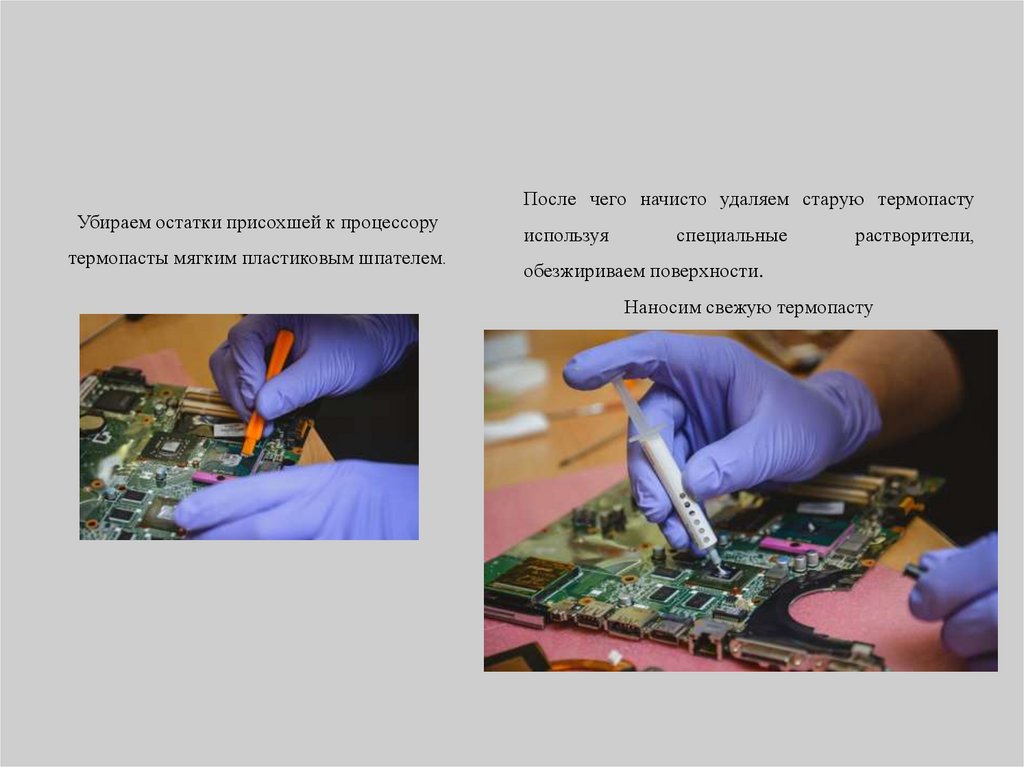 После чего начисто удаляем старую термопастуУбираем остатки присохшей к процессору