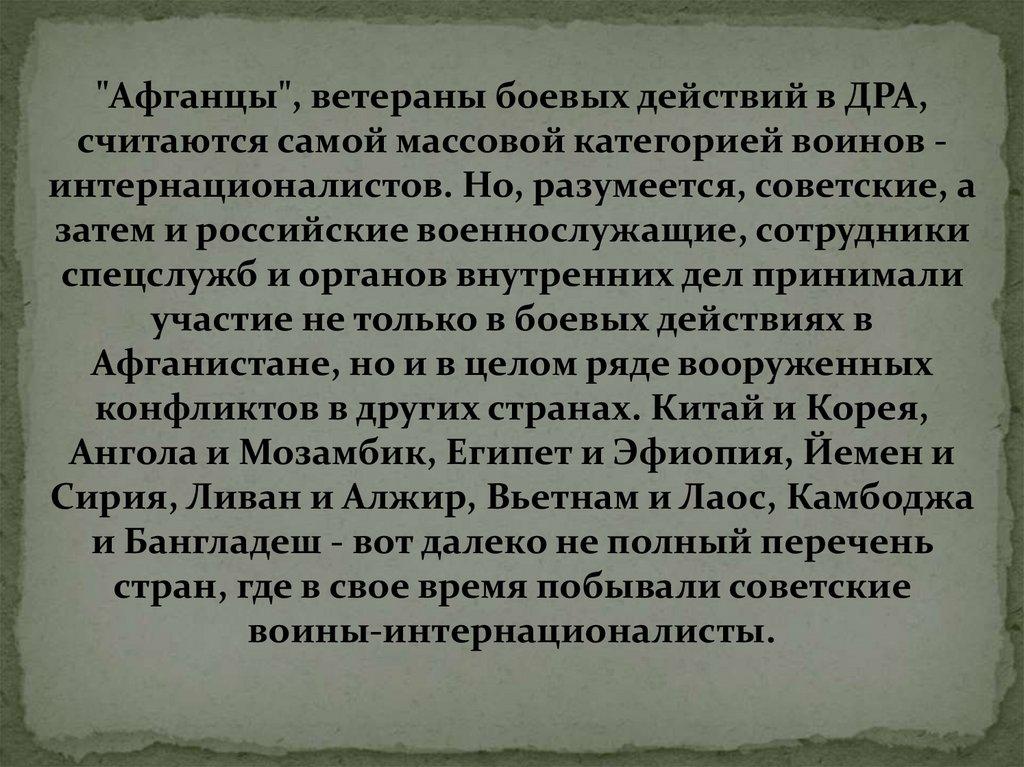 "Афганцы", ветераны боевых действий в ДРА,считаются самой массовой категорией воинов интернационалистов. Но, разумеется, советские, а